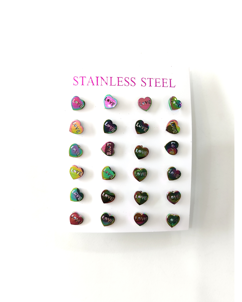 Pack de 12 pares de aros en acero tornasol en forma de corazón