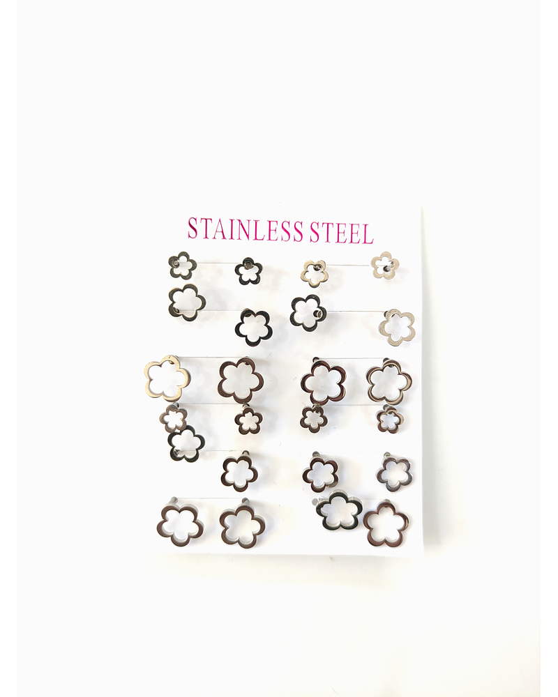 Pack de 12 pares de aros en acero plateado de tope en forma de flor