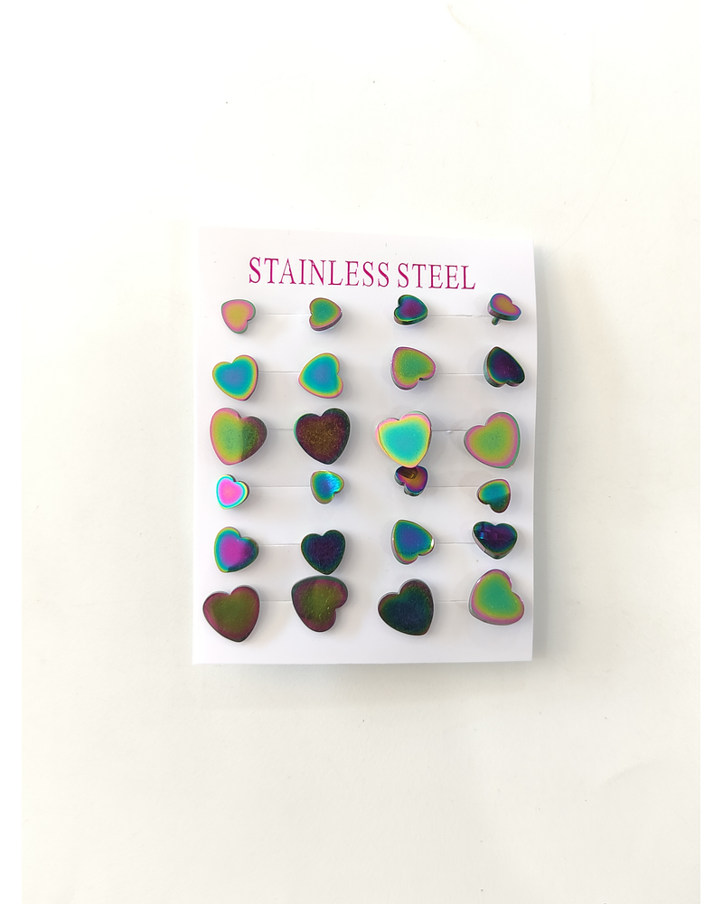Pack de 12 pares de aros en acero tornasol de tope en forma de corazón