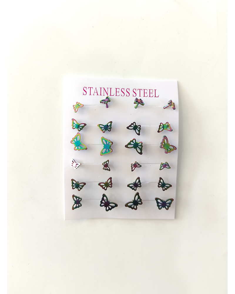Pack de 12 pares de aros en acero tornasol de tope en forma de mariposas